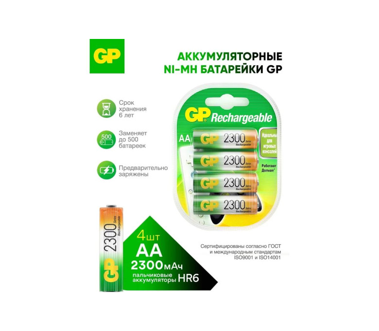 Перезаряжаемые аккумуляторы GP 230AAHC AA, емкость 2300 мАч - 4 шт. 230AAHC-2DECRC4 GP 230AAHC-2DECRC4 идеально подходят для использования в компьютерных мышках, клавиатурах, детских игрушках, часах, радиоприборах и других бытовых устройствах.