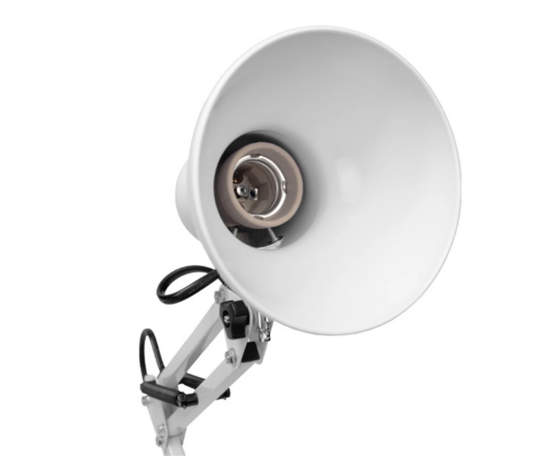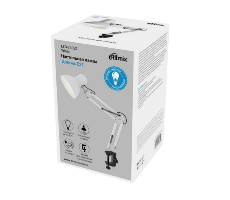 Настольный светильник Ritmix LED-740ES белого цвета питается от сети с помощью кабеля. Для начала работы в него нужно поместить лампу с цоколем Е27 и допустимой мощностью 7 Вт, которая прилагается в комплекте.