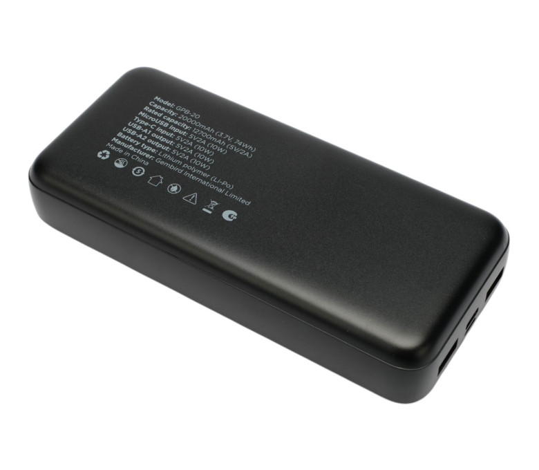 Портативный аккумулятор повышенной ёмкости Gembird GPB-20 – надёжное решение для тех, кто ценит мобильность и хочет быть всегда на связи даже в длительных поездках!