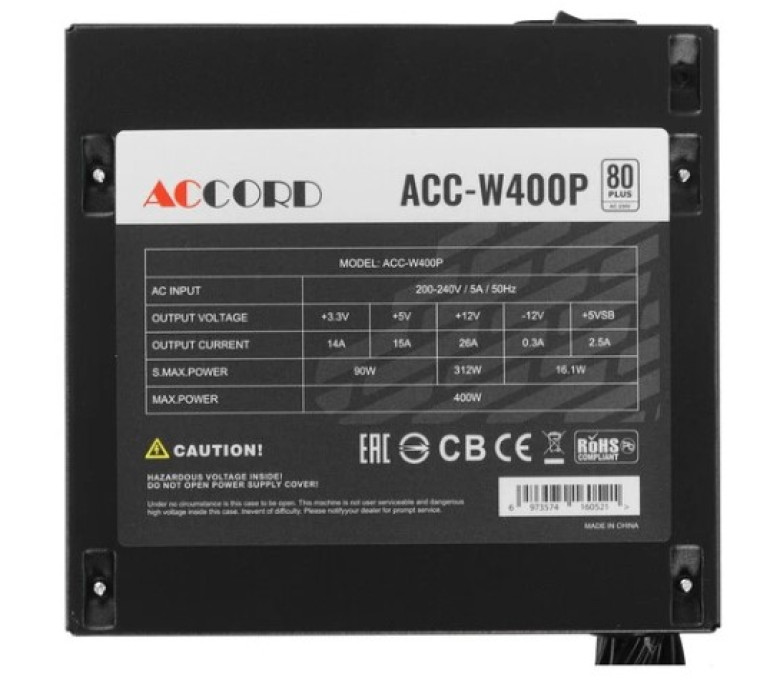 Блок питания Accord ACC-W400P представляет собой надежный источник питания для персонального компьютера. Этот блок питания имеет сертификацию 80 PLUS WHITE, что гарантирует его энергоэффективность. Он оснащен стандартным 20+4-пиновым разъемом для подключения к материнской плате, обеспечивая совместимость с широким спектром систем. Для охлаждения используется 120-миллиметровый вентилятор, который эффективно отводит тепло и поддерживает оптимальную температуру внутри корпуса. Блок питания также оборудован шестью разъемами SATA, что позволяет подключить достаточное количество устройств хранения данных и других компонентов, требующих питания через SATA-интерфейс.