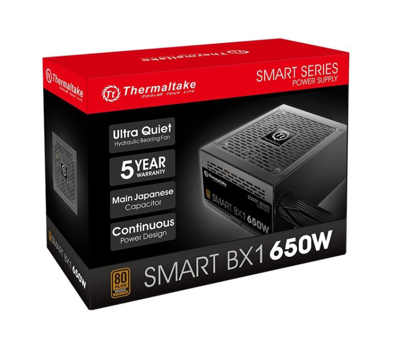 Блок питания Thermaltake Smart BX1 650W [PS-SPD-0650NNSABE-1] может «похвастаться» безупречной сборкой, качественными компонентами и способностью обеспечивать стабильное напряжение при работе. Стильный дизайн модели также достоин внимания. Это значит, что устройство для питания отлично смотрится в составе любой сборки.