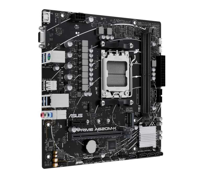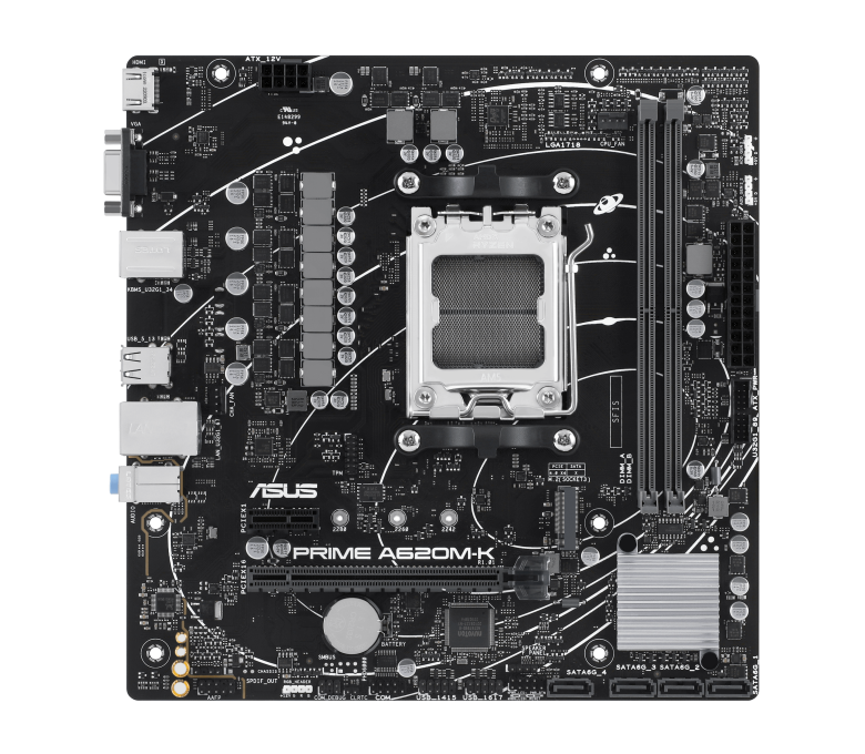 Подключение ASUS PRIME A620M-K к Интернету выполняется с помощью адаптера LAN со скоростью 1 Гбит/с. Система пассивного охлаждения поддерживает низкую температуру печатной платы и компонентов. Для подключения вентиляторов есть 2 коннектора 4-pin. На панели с интерфейсами доступны видеовыходы HDMI и VGA (D-Sub), порты USB и разъемы аудио для периферийных устройств.