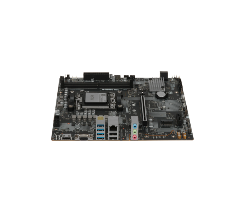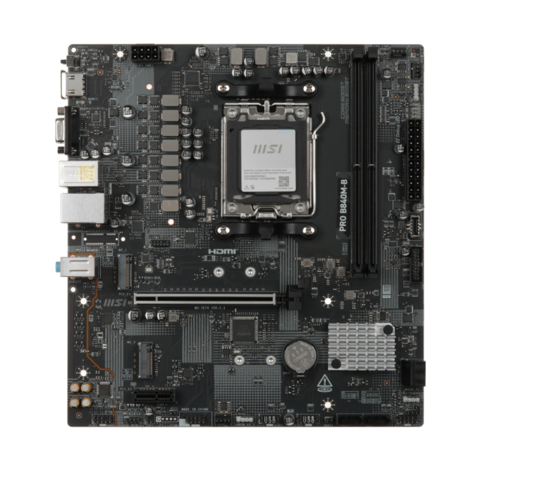 Материнская плата MSI PRO B840M-B. Устройство форм-фактора Micro ATX с размерами 244x226 мм подходит для сборки мощного универсального компьютера для дома или офиса. Плата работает под управлением чипсета AMD B840 и поддерживает процессоры AMD Ryzen 7000, 8000 и 9000. Схема питания 7+2+1 гарантирует реализацию потенциала мощных игровых CPU, а подсистема памяти с поддержкой технологий разгона AMD EXPO обеспечивает стабильность работы производительных модулей DDR5. Максимальный объем ОЗУ равен 128 ГБ.