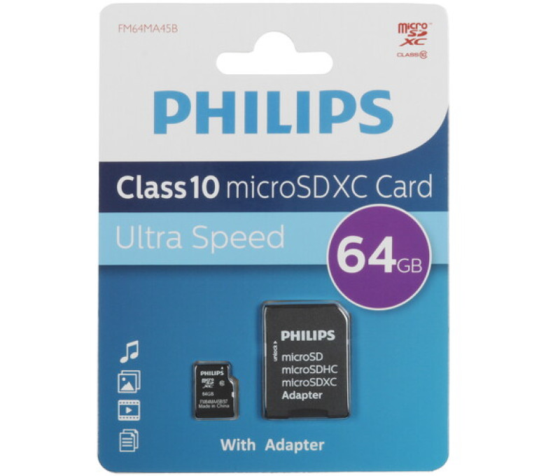 Карта памяти Philips microSDHC соответствует стандарту Class 10. Это позволяет хранить и воспроизводитель видео формата 4K со скоростью 10 Мбайт/с. Карта памяти представлена в форм-факторе microSDHC и поставляется вместе с адаптером SD. Благодаря этому обеспечивается совместимость с компьютерами, смартфонами, планшетами, камерами, видеорегистраторами и другой техникой. Для хранения документов, приложений и мультимедийных файлов карта памяти Philips microSDHC предлагает 64 ГБ свободного пространства.