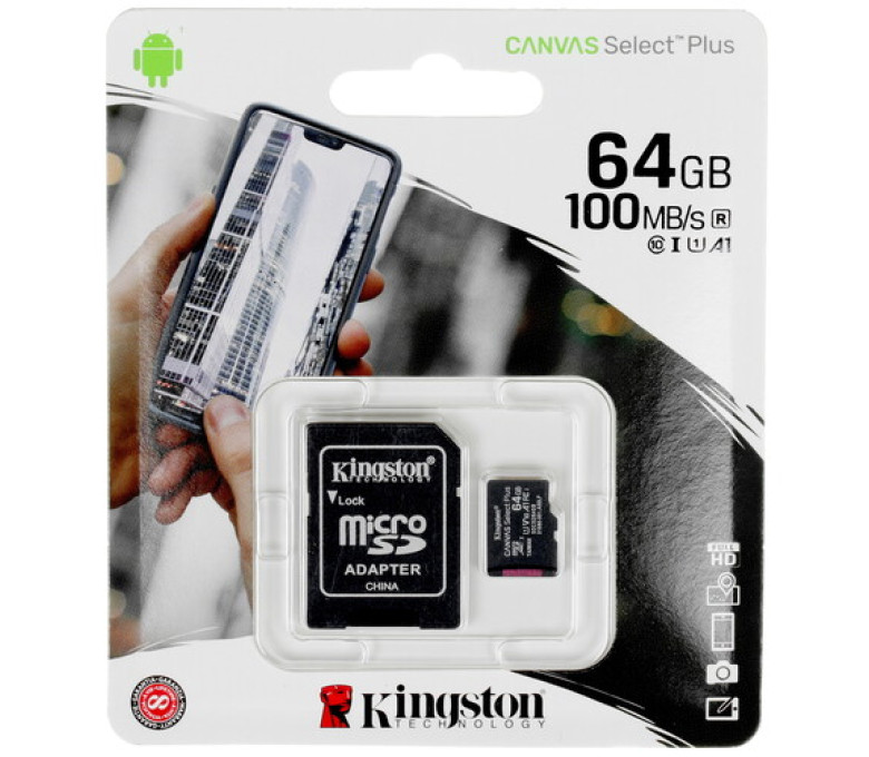 Скорость в режиме чтения достигает показателя 100 Мб/с. В комплекте с Kingston Canvas Select Plus microSDXC 64 ГБ [SDCS2/64GB] предусмотрен адаптер SD.