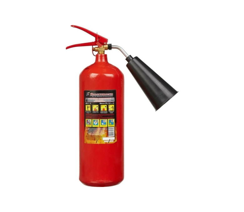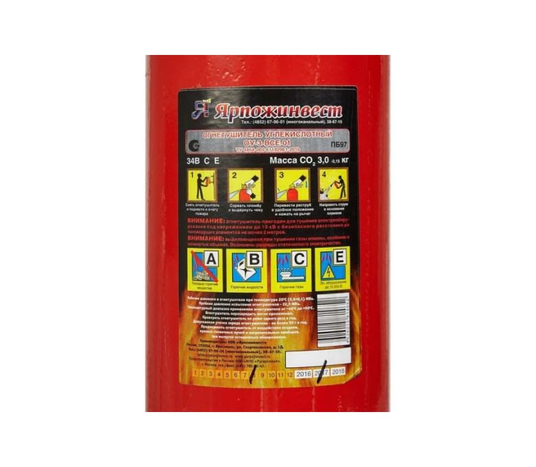 Огнетушитель углекислотный Ярпожинвест ОУ-3 ВСЕ – закачной огнетушитель высокого давления с зарядом жидкой двуокиси углерода (ГОСТ 8050-85), находящейся под давлением жидких паров. Применяется для первичного тушения пожаров и возгораний класса B, C, E (горючие и легковоспламеняющиеся жидкости, горючие газы, электроустановки, не превышающие напряжение 10000 Вольт). Основным преимуществом углекислотного огнетушителя является то, что двуокись углерода не повреждает объект тушения и не оставляет следов.