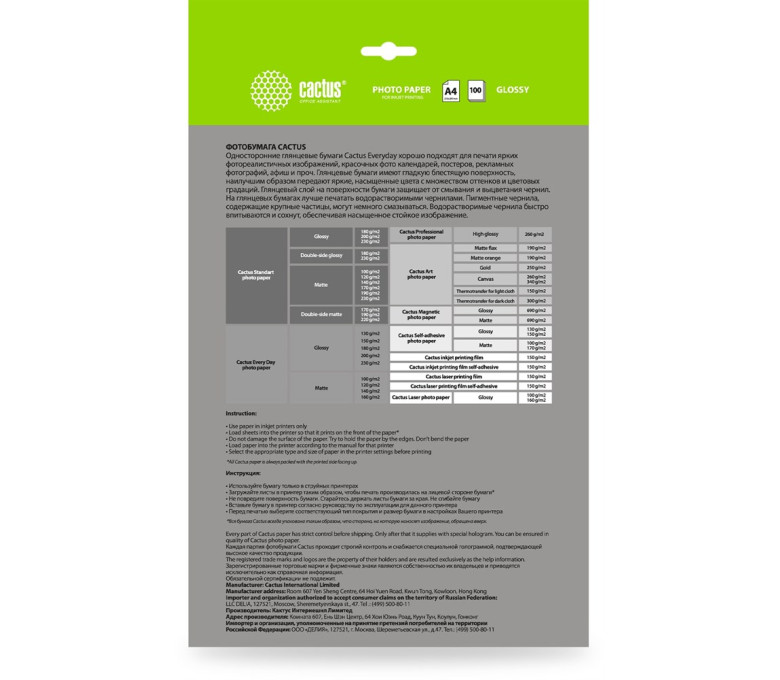 Глянцевая фотобумага Cactus серии Every Day для струйной печати. Идеально подойдет для повседневного использования и экономичного режима цветной печати. На глянцевой бумаге рекомендуется печатать водорастворимыми чернилами. Поры покрытия мелкие и не пропускают частицы некоторых видов пигментных чернил, поэтому пигментные чернила могут немного смазываться. Водорастворимые чернила быстро впитываются и закрепляются, создавая яркое и насыщенное изображение.