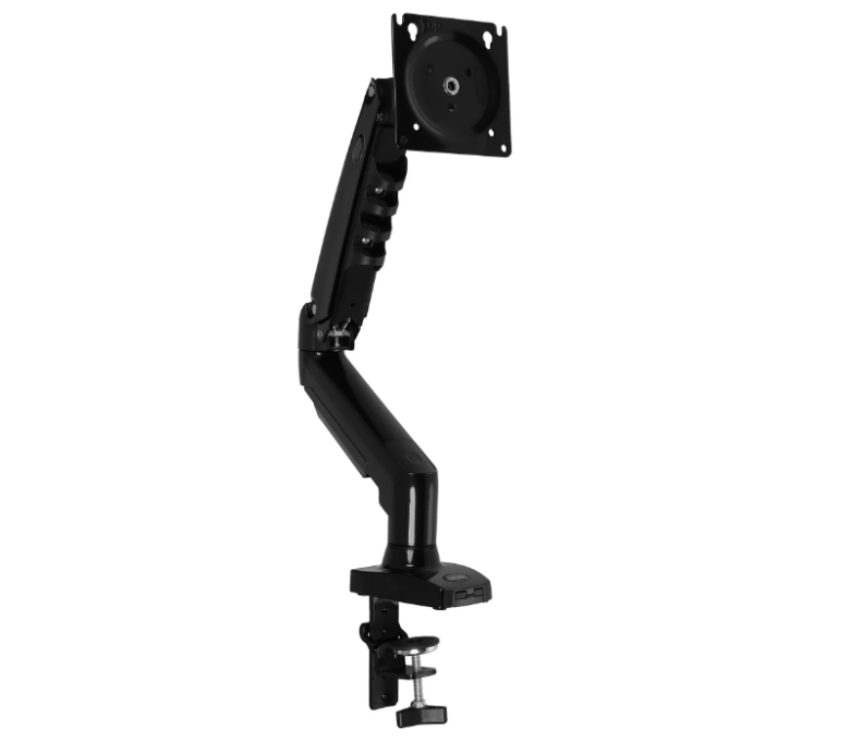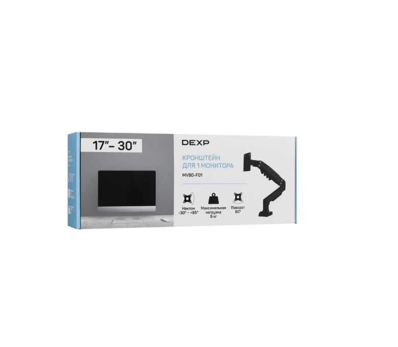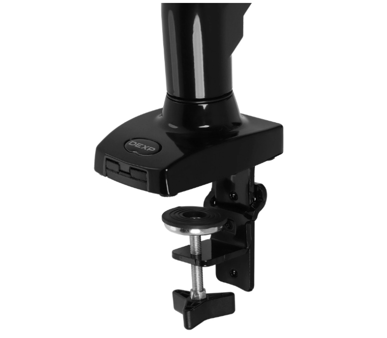 Крепление DEXP MV80-F01 предоставляет возможность установки монитора с диагональю экрана 17-30 дюймов. Оно оснащено струбциной и предусматривает фиксацию на столешнице толщиной 20-80 мм. Наклонно-поворотная конструкция обеспечивает регулировку положения монитора. Для аккуратной укладки проводов реализован кабель-канал.