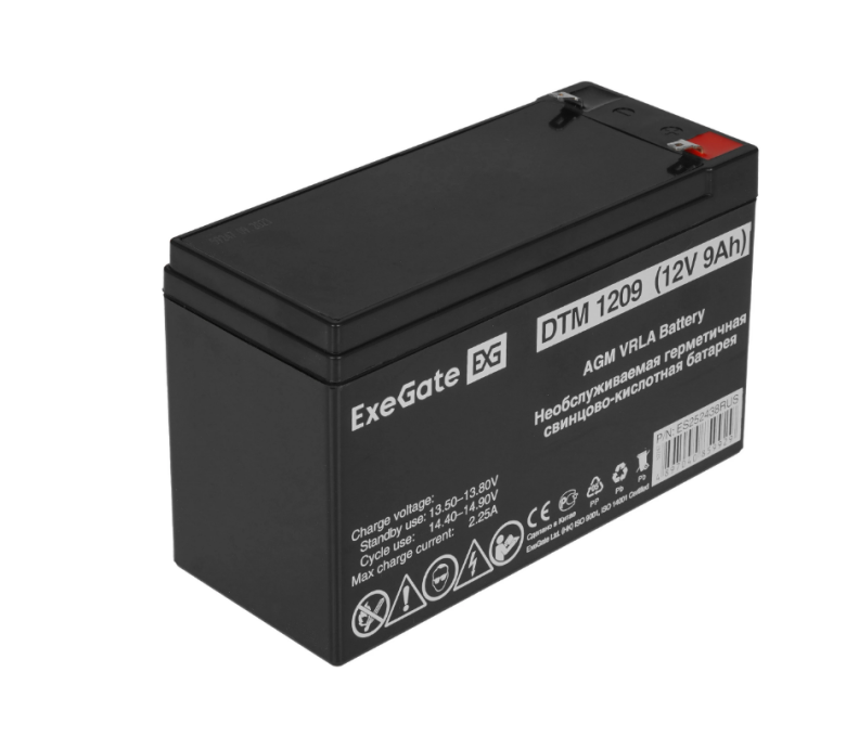 Свинцово-кислотная АКБ ExeGate DTM 1209 обладает емкостью 9 А∙ч. Батарея со стабильным напряжением 12 В подходит для питания большинства бытовых устройств с мощностью в диапазоне 600-800 Вт. Модель со сроком службы 6 лет выдерживает 240 циклов полной зарядки.