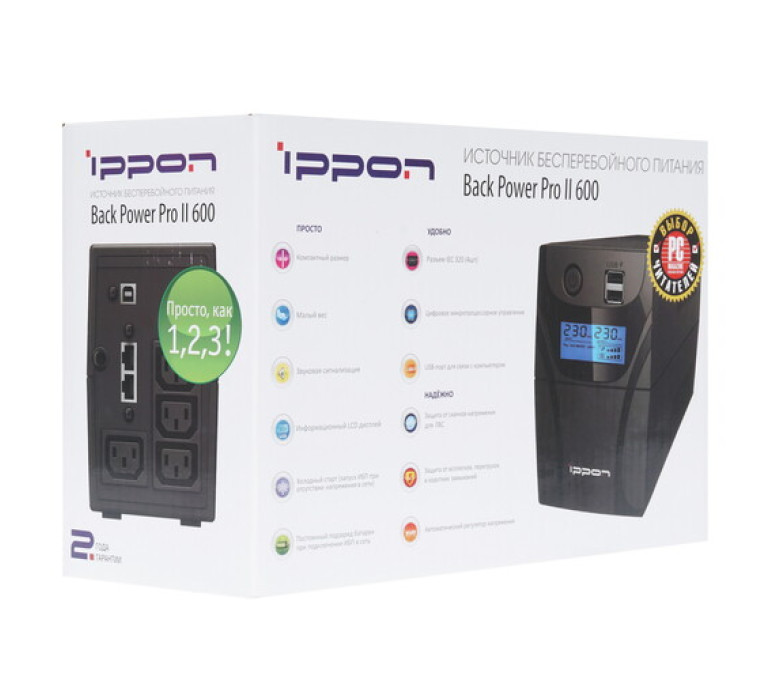 ИБП IPPON Back Power PRO ll 600 — линейно-интерактивное устройство с батареей емкостью 12В/7А-ч, что вкупе с максимальной выходной мощностью устройства в 360 Вт может обеспечить до 1 минуты работы. Скорость переключения на резервное питание не превышает 10 мс. Модель оснащена 4 компьютерными разъема IEC 320 C13 с поддержкой автономного питания, а также портом USB и RG-45 для связи с ПК с целью мониторинга состояния источника питания. Также на передней панели расположен ЖК-дисплей для вывода ключевой информации о работе. Время зарядки встроенного аккумулятора составляет 4 часа. Есть звуковая сигнализация. Комплект поставки включает в себя кабель питания.